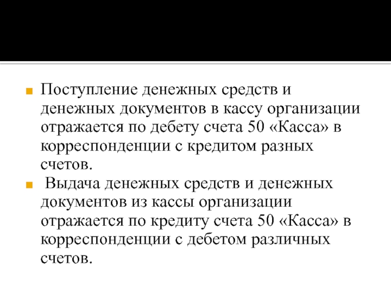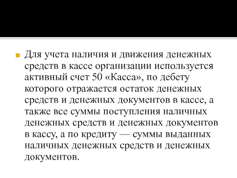 активный счет 50 «Касса», по дебету которого отражается остаток денежных средств и денежных документов в кассе, а также все суммы поступления наличных денежных средств и денежных документов в кассу, а по кредиту — суммы выданных наличных денежных средств и денежных документов.