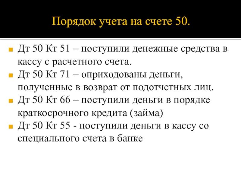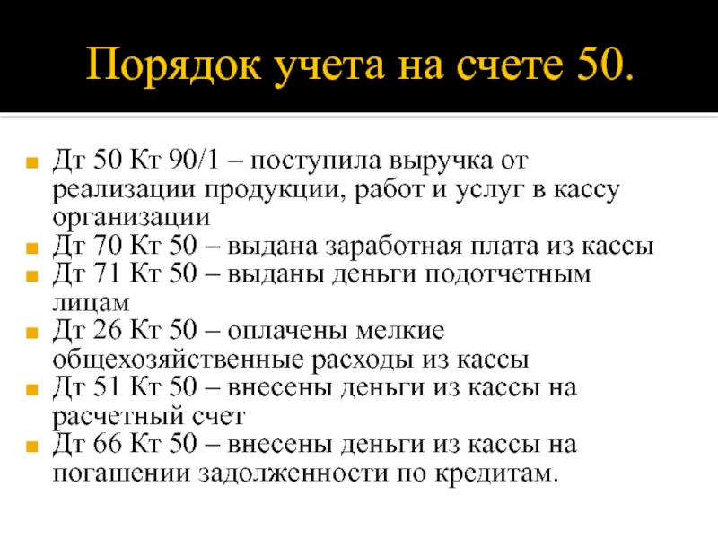 дебету счета 50 «Касса» в корреспонденции с кредитом разных счетов.