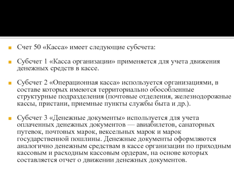 Субсчет 2 «Операционная касса» используется организациями, в составе которых имеются территориально обособленные структурные подразделения (почтовые отделения, железнодорожные кассы, пристани, приемные пункты службы быта и др.).