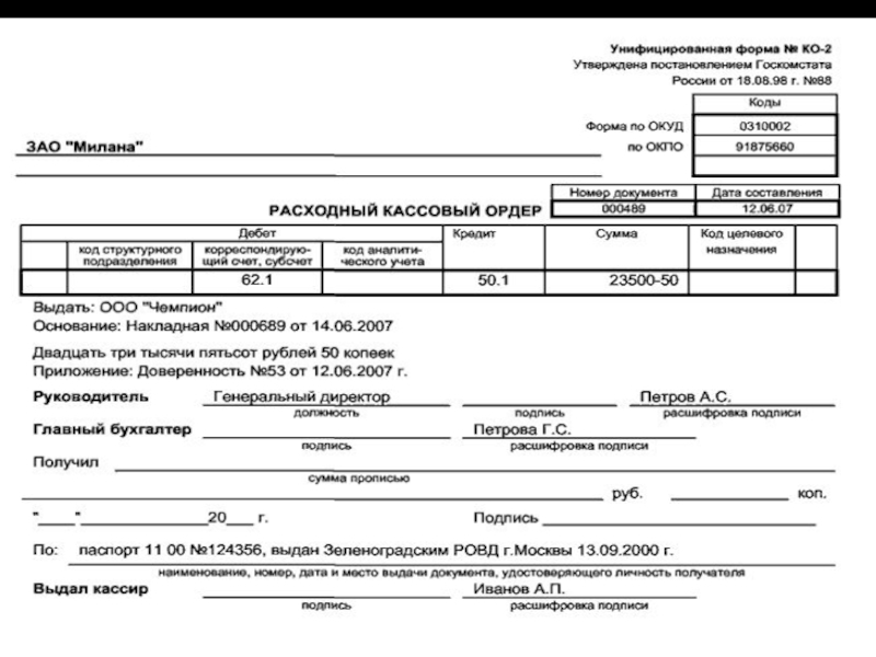 В отдельных случаях разрешается замена составления расходного кассового ордера документами на расходование денежных средств в кассе. Это: платежные или расчетно-платежные ведомости на выдачу заработной платы из кассы организации; заявления на выдачу денег; счета и др. Документы на выдачу денег подписываются руководителем и главным бухгалтером организации. Расходные кассовые ордера также нумеруются с начала отчетного года.