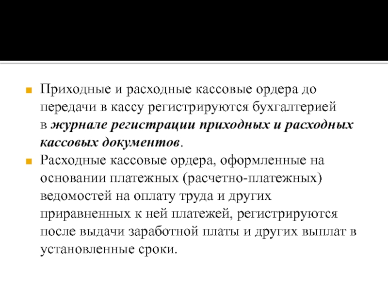 Слайд 8Приходные и расходные кассовые ордера до передачи в кассу регистрируются бухгалтерией