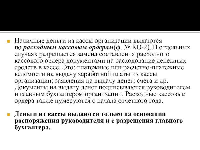 Слайд 6Наличные деньги из кассы организации выдаются по расходным кассовым ордерам(ф. № КО-2).
