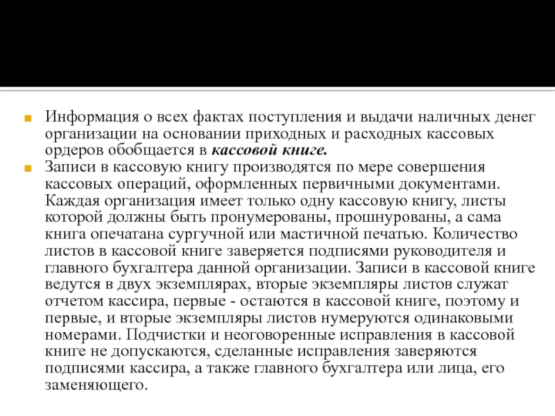 Записи в кассовую книгу производятся по мере совершения кассовых операций, оформленных первичными документами. Каждая организация имеет только одну кассовую книгу, листы которой должны быть пронумерованы, прошнурованы, а сама книга опечатана сургучной или мастичной печатью. Количество листов в кассовой книге заверяется подписями руководителя и главного бухгалтера данной организации. Записи в кассовой книге ведутся в двух экземплярах, вторые экземпляры листов служат отчетом кассира, первые - остаются в кассовой книге, поэтому и первые, и вторые экземпляры листов нумеруются одинаковыми номерами. Подчистки и неоговоренные исправления в кассовой книге не допускаются, сделанные исправления заверяются подписями кассира, а также главного бухгалтера или лица, его заменяющего.