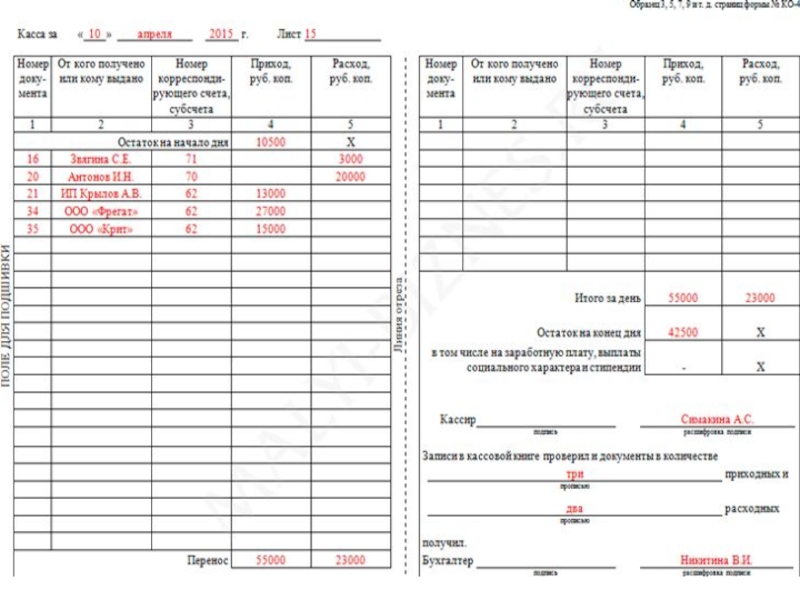 день, выводится остаток денег в кассе на следующее число и передается в бухгалтерию в качестве отчета кассира второй отрывной лист (копия записей в кассовой книге за день) с приходными и расходными кассовыми документами под расписку в кассовой книге.