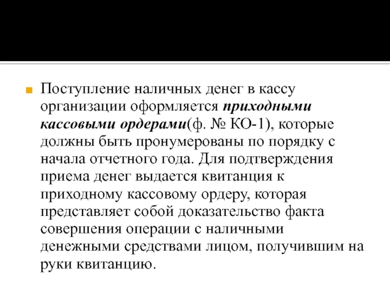 Слайд 4Поступление наличных денег в кассу организации оформляется приходными кассовыми ордерами(ф. № КО-1),