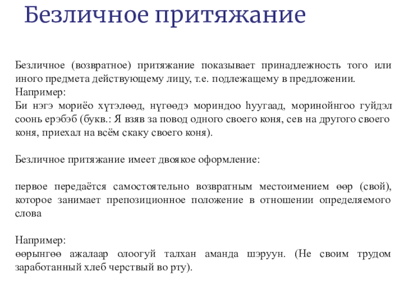 Безличное (возвратное) притяжание показывает принадлежность того или иного предмета действующему