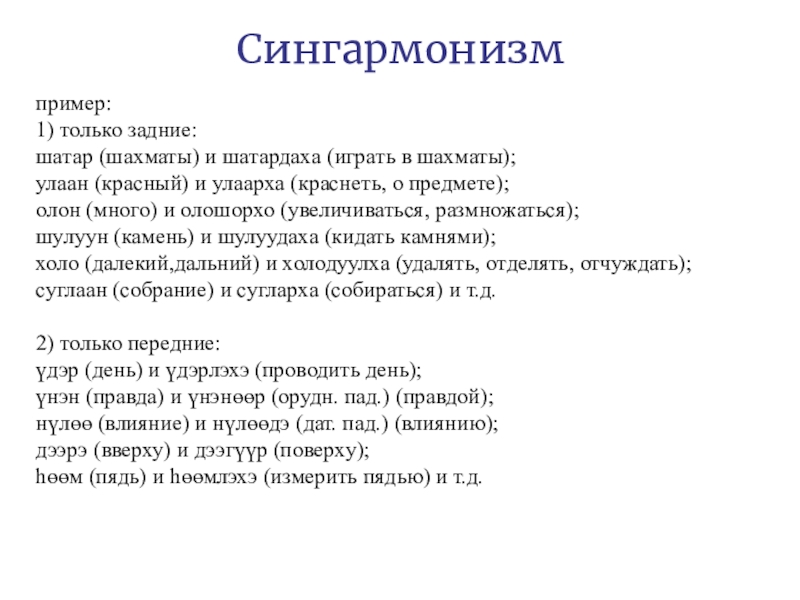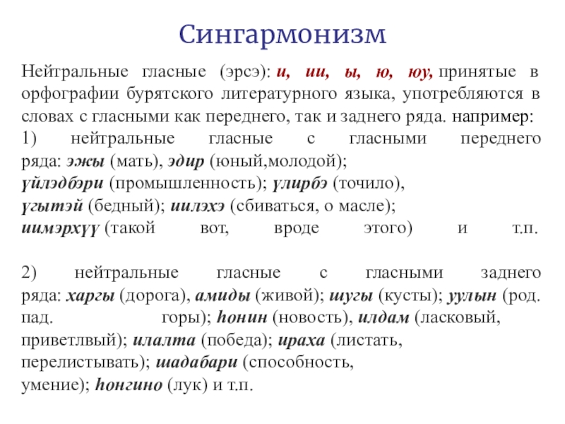2) нейтральные гласные с гласными заднего ряда: харгы (дорога), амиды (живой); шугы (кусты); уулын (род. пад. горы); һонин (новость), илдам (ласковый, приветлвый); илалта (победа); ираха (листать, перелистывать); шадабари (способность, умение); һонгино (лук) и т.п.