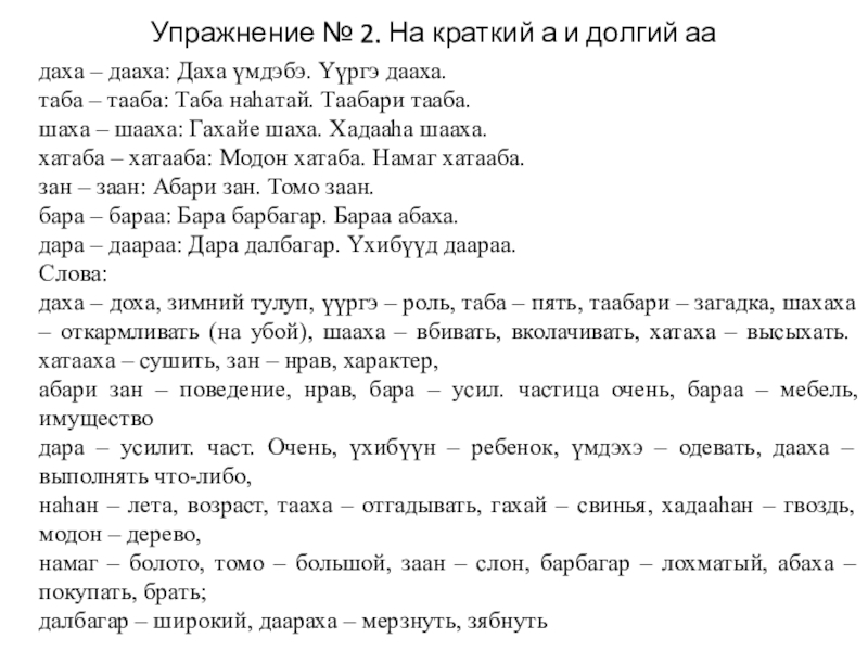 Слайд 10Упражнение № 2. На краткий а и долгий аа