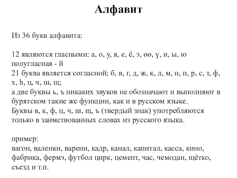 а две буквы ь, ъ никаких звуков не обозначают и выполняют в бурятском такие же функции, как и в русском языке.