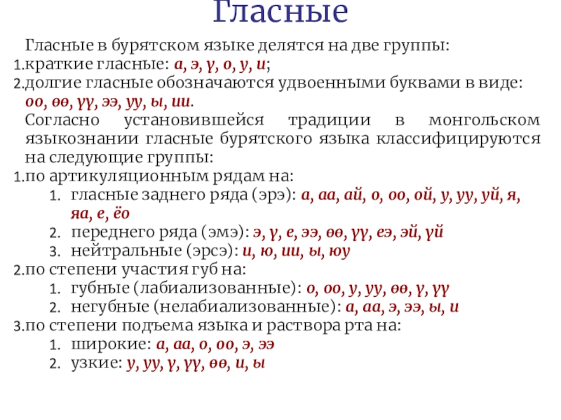Согласно установившейся традиции в монгольском языкознании гласные бурятского языка классифицируются на следующие группы:
