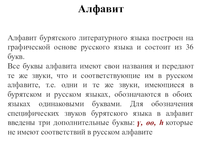 Все буквы алфавита имеют свои названия и передают те же звуки, что и соответствующие им в русском алфавите, т.е. одни и те же звуки, имеющиеся в бурятском и русском языках, обозначаются в обоих языках одинаковыми буквами. Для обозначения специфических звуков бурятского языка в алфавит введены три дополнительные буквы: ү, өө, һ которые не имеют соответствий в русском алфавите