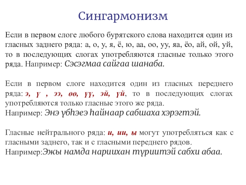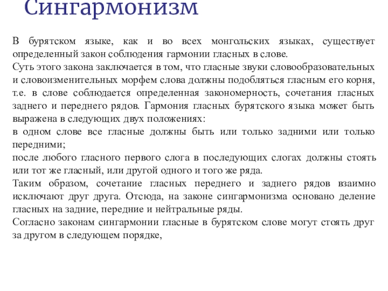 Суть этого закона заключается в том, что гласные звуки словообразовательных и словоизменительных морфем слова должны подобляться гласным его корня, т.е. в слове соблюдается определенная закономерность, сочетания гласных заднего и переднего рядов. Гармония гласных бурятского языка может быть выражена в следующих двух положениях: