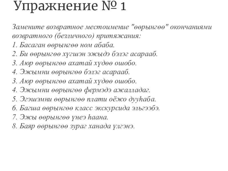 Замените возвратное местоимение "өөрынгөө" окончаниями возвратного (безличного) притяжания: