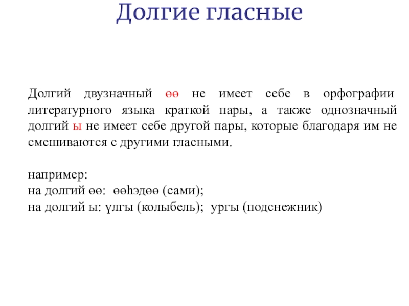 К долгим гласным относятся: аа, оо, ээ, ии, уу, өө, үү,