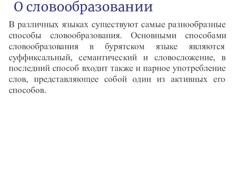 словообразования в бурятском языке являются суффиксальный, семантический и словосложение, в последний способ входит также и парное употребление слов, представляющее собой один из активных его способов.