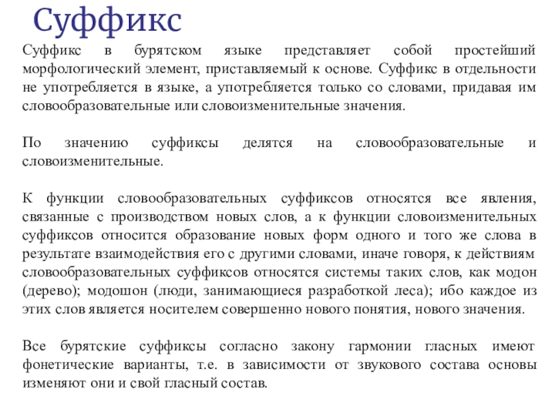 Суффикс в бурятском языке представляет собой простейший морфологический элемент, приставляемый к