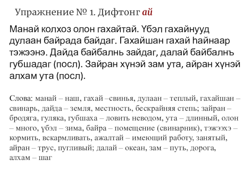 Слова: манай – наш, гахай –свинья, дулаан – теплый, гахайшан – свинарь, дайда – земля, местность, бескрайняя степь; зайран – бродяга, гуляка, губшаха – ловить неводом, ута – длинный, олон – много, үбэл – зима, байра – помещение (свинарник), тэжээхэ – кормить, вскармливать, ажалтай – имеющий работу, занятый, айран – трус, пугливый; далай – океан, зам – путь, дорога,