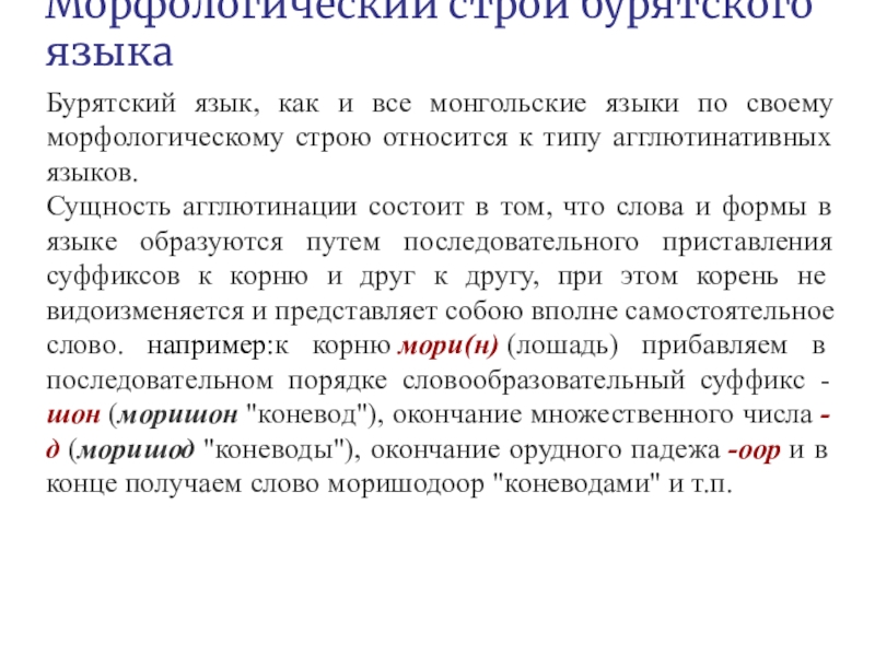 Сущность агглютинации состоит в том, что слова и формы в языке образуются путем последовательного приставления суффиксов к корню и друг к другу, при этом корень не видоизменяется и представляет собою вполне самостоятельное слово. например:к корню мори(н) (лошадь) прибавляем в последовательном порядке словообразовательный суффикс -шон (моришон "коневод"), окончание множественного числа -д (моришод "коневоды"), окончание орудного падежа -оор и в конце получаем слово моришодоор "коневодами" и т.п.
