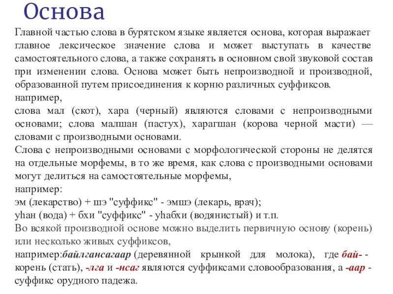 Главной частью слова в бурятском языке является основа, которая выражает главное