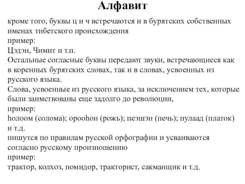 Остальные согласные буквы передают звуки, встречающиеся как в коренных бурятских словах, так и в словах, усвоенных из русского языка.