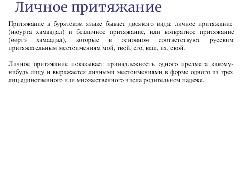 Притяжание в бурятском языке бывает двоякого вида: личное притяжание (нюурта