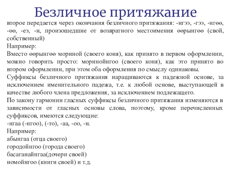 хамаадал) и безличное притяжание, или возвратное притяжание (өөртэ хамаадал), которые в основном соответствуют русским притяжательным местоимениям мой, твой, его, ваш, их, свой.