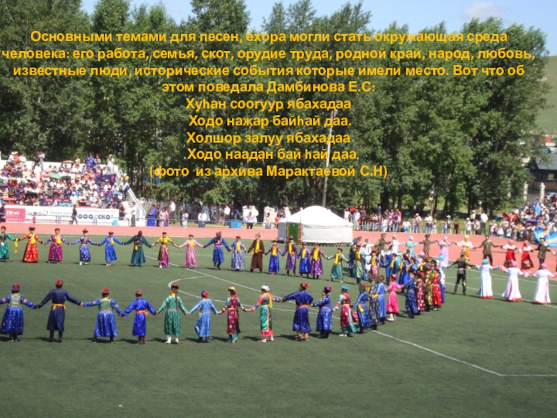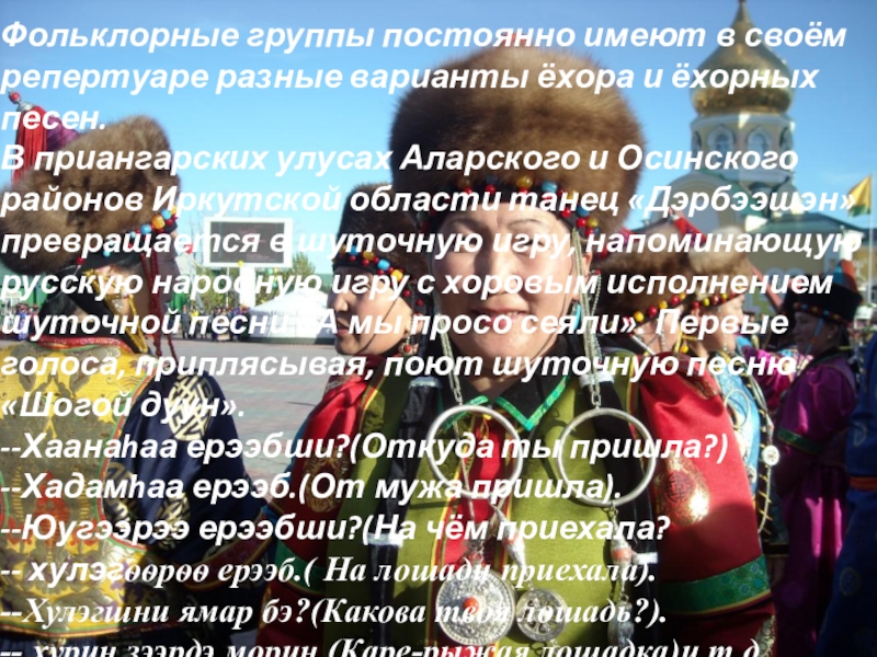 Слайд 26Песни, под которые исполняют ёхор, имеют различные содержание и тематику. В