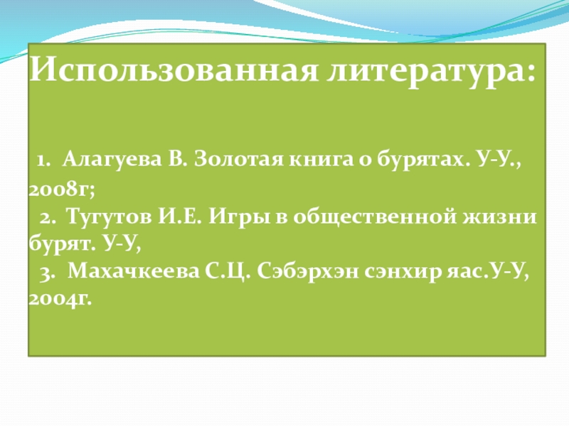 1. Алагуева В. Золотая книга о бурятах. У-У., 2008г;