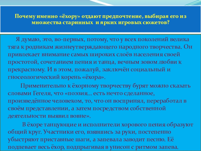 что у всех поколений велика тяга к родникам жизнеутверждающего народного творчества. Он привлекает внимание самых широких слоёв населения своей простотой, сочетанием пения и танца, вечным зовом любви к прекрасному. И в этом, пожалуй, заключён социальный и гносеологический корень «ёхора».