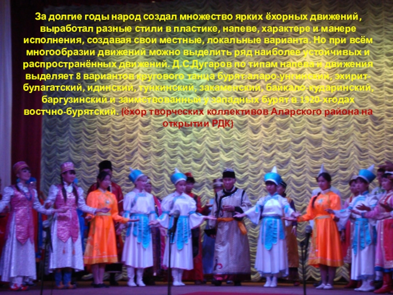 стили в пластике, напеве, характере и манере исполнения, создавая свои местные, локальные варианта. Но при всём многообразии движений можно выделить ряд наиболее устойчивых и распространённых движений. Д.С.Дугаров по типам напева и движения выделяет 8 вариантов кругового танца бурят:аларо-унгинский, эхирит-булагатский, идинский, тункинский, закаменский, байкало-кударинский, баргузинский и заимствованный у западных бурят в 1920-хгодах востчно-бурятский. (ёхор творческих коллективов Аларского района на открытии РДК)