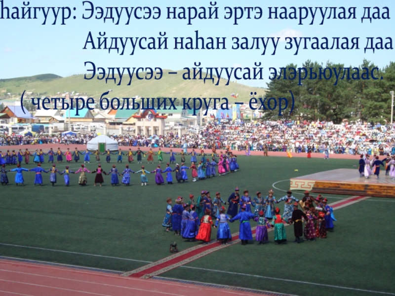 молодого гостя или гостьи. Но чаще всего по инициативе молодёжи он проходил как увеселительное самодеятельное зрелище, которое называлось «тухэрѳѳн наадан». Этот наадан у нас называется «Зѳѳзэйн наадан»(Саламатный ёхор). Молодёжный ёхор на открытии фестиваля «Алтаргана»