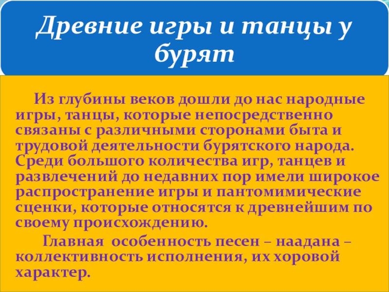 глубины веков дошли до нас народные игры, танцы, которые непосредственно связаны с различными сторонами быта и трудовой деятельности бурятского народа. Среди большого количества игр, танцев и развлечений до недавних пор имели широкое распространение игры и пантомимические сценки, которые относятся к древнейшим по своему происхождению.