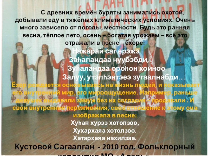 охотой, добывали еду в тяжёлых климатических условиях. Очень много зависело от погоды, местности. Будь это ранняя весна, тёплое лето, осень – богатая урожаем – всё это отражали в песне – ёхоре:
