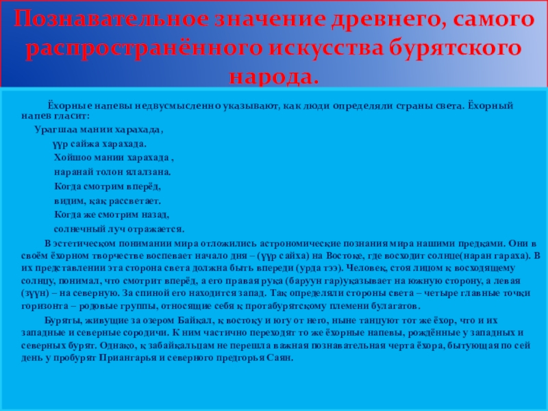 Слайд 16Познавательное значение древнего, самого распространённого искусства бурятского народа.