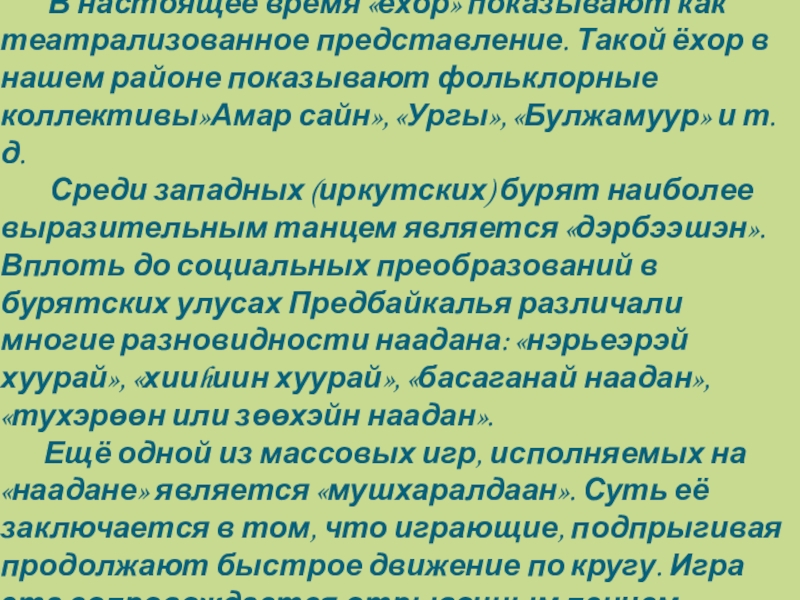 представление. Такой ёхор в нашем районе показывают фольклорные коллективы»Амар сайн», «Ургы», «Булжамуур» и т.д.