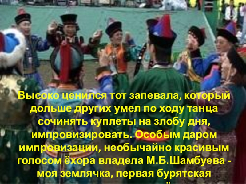 сочинять куплеты на злобу дня, импровизировать. Особым даром импровизации, необычайно красивым голосом ёхора владела М.Б.Шамбуева - моя землячка, первая бурятская женщина – режиссёр.