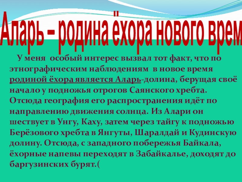 что по этнографическим наблюдениям в новое время родиной ёхора является Аларь-долина, берущая своё начало у подножья отрогов Саянского хребта. Отсюда география его распространения идёт по направлению движения солнца. Из Алари он шествует в Унгу, Каху, затем через тайгу к подножью Берёзового хребта в Янгуты, Шаралдай и Кудинскую долину. Отсюда, с западного побережья Байкала, ёхорные напевы переходят в Забайкалье, доходят до баргузинских бурят.(