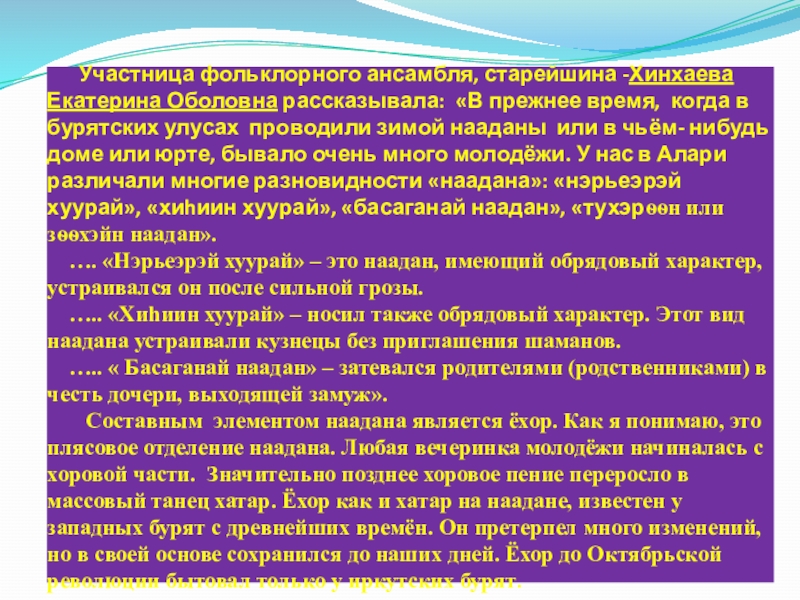 рассказывала: «В прежнее время, когда в бурятских улусах проводили зимой нааданы или в чьём- нибудь доме или юрте, бывало очень много молодёжи. У нас в Алари различали многие разновидности «наадана»: «нэрьеэрэй хуурай», «хиhиин хуурай», «басаганай наадан», «тухэрѳѳн или зѳѳхэйн наадан».