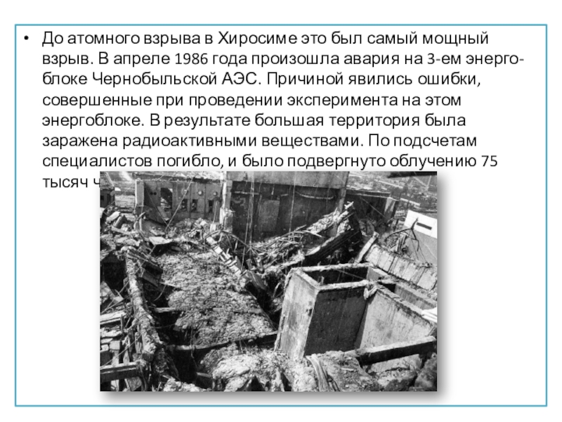 апреле 1986 года произошла авария на 3-ем энерго-блоке Чернобыльской АЭС. Причиной явились ошибки, совершенные при проведении эксперимента на этом энергоблоке. В результате большая территория была заражена радиоактивными веществами. По подсчетам специалистов погибло, и было подвергнуто облучению 75 тысяч человек.