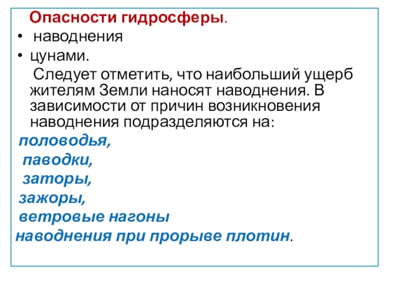 отметить, что наибольший ущерб жителям Земли наносят наводнения. В зависимости от причин возникновения наводнения подразделяются на: