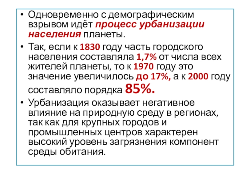 Слайд 26Одновременно с демографическим взрывом идёт процесс урбанизации населения планеты.