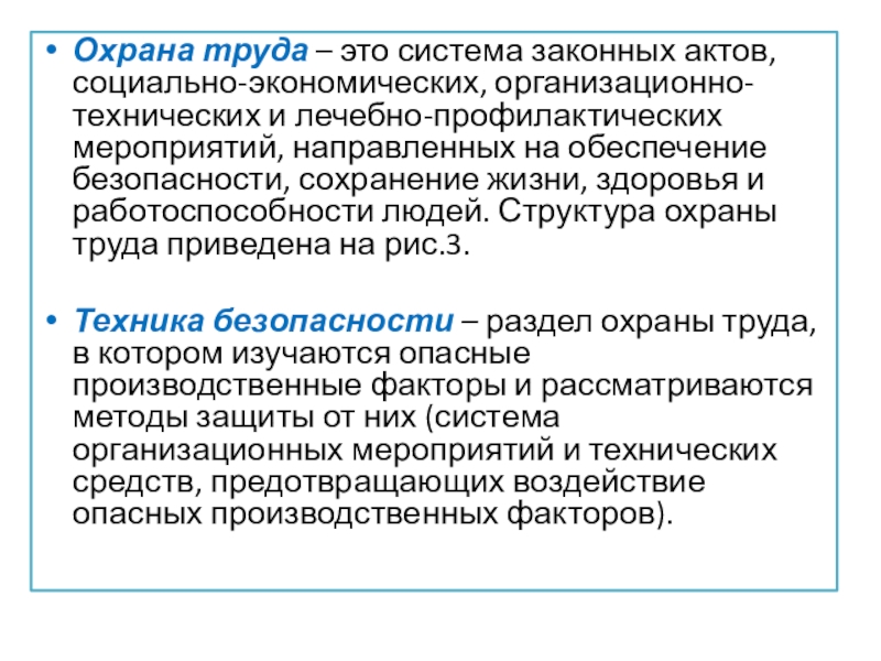 Техника безопасности – раздел охраны труда, в котором изучаются опасные производственные факторы и рассматриваются методы защиты от них (система организационных мероприятий и технических средств, предотвращающих воздействие опасных производственных факторов).