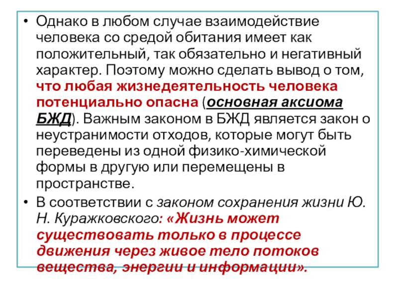 положительный, так обязательно и негативный характер. Поэтому можно сделать вывод о том, что любая жизнедеятельность человека потенциально опасна (основная аксиома БЖД). Важным законом в БЖД является закон о неустранимости отходов, которые могут быть переведены из одной физико-химической формы в другую или перемещены в пространстве.