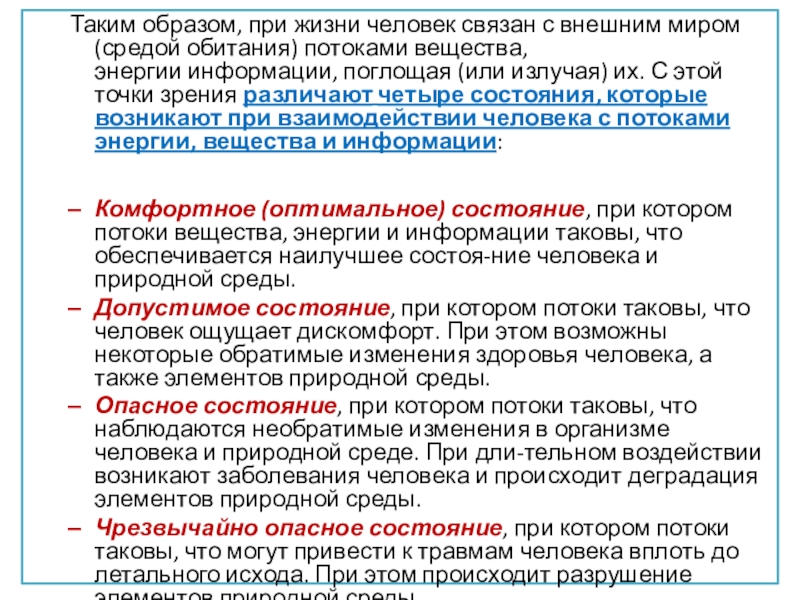 потоками вещества, энергии информации, поглощая (или излучая) их. С этой точки зрения различают четыре состояния, которые возникают при взаимодействии человека с потоками энергии, вещества и информации: