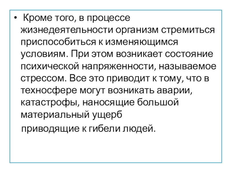 Слайд 32 Кроме того, в процессе жизнедеятельности организм стремиться приспособиться к изменяющимся