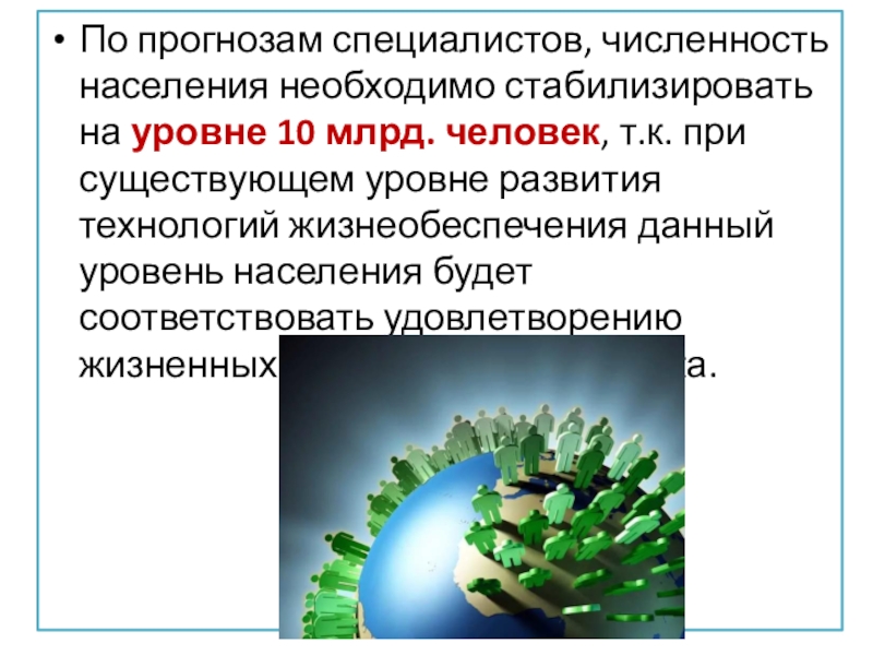 Слайд 25По прогнозам специалистов, численность населения необходимо стабилизировать на уровне 10 млрд.
