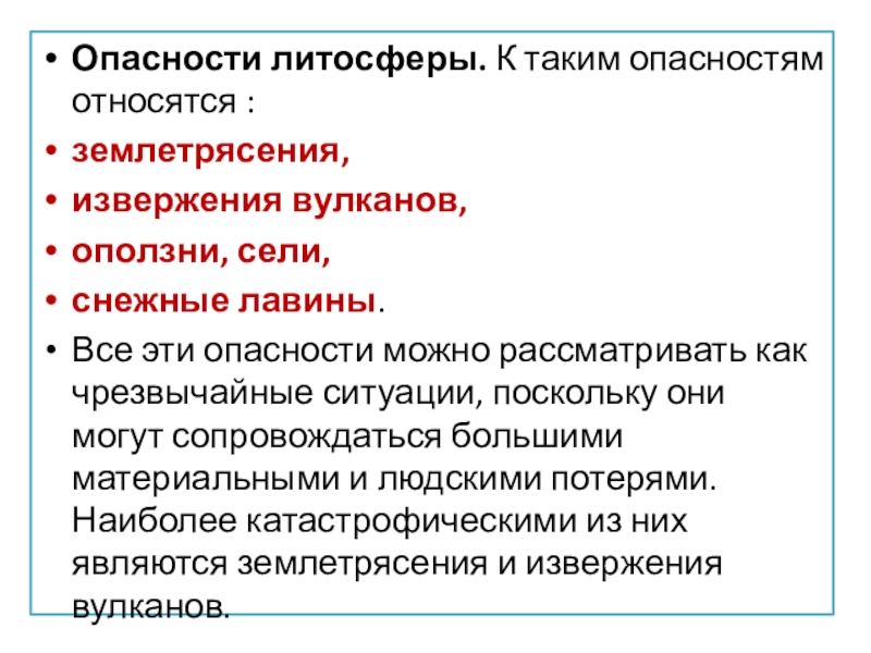 Слайд 5Опасности литосферы. К таким опасностям относятся :