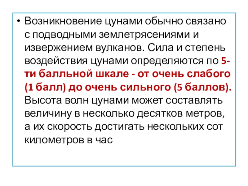 Слайд 16Возникновение цунами обычно связано с подводными землетрясениями и извержением вулканов. Сила