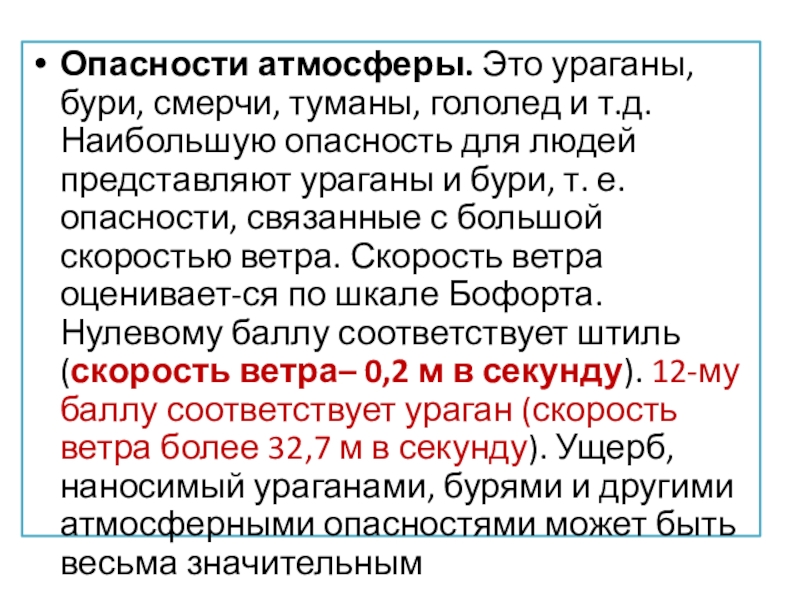 опасность для людей представляют ураганы и бури, т. е. опасности, связанные с большой скоростью ветра. Скорость ветра оценивает-ся по шкале Бофорта. Нулевому баллу соответствует штиль (скорость ветра– 0,2 м в секунду). 12-му баллу соответствует ураган (скорость ветра более 32,7 м в секунду). Ущерб, наносимый ураганами, бурями и другими атмосферными опасностями может быть весьма значительным