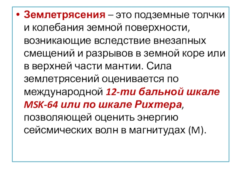 внезапных смещений и разрывов в земной коре или в верхней части мантии. Сила землетрясений оценивается по международной 12-ти бальной шкале MSK-64 или по шкале Рихтера, позволяющей оценить энергию сейсмических волн в магнитудах (M).